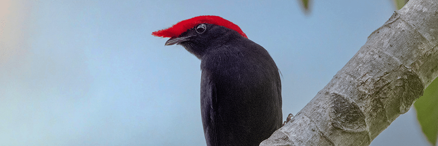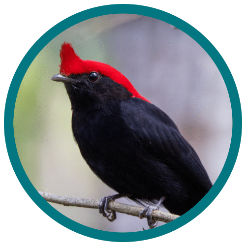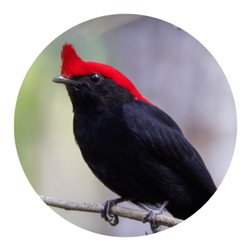 Este pássaro notável é facilmente reconhecível por sua plumagem vibrante, onde o macho apresenta um contraste impressionante com sua cabeça negra e uma crista vermelha brilhante.